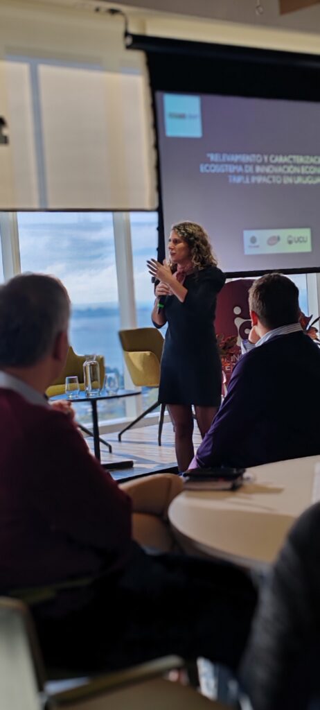 Uno de los momentos centrales del encuentro fue la presentación de los resultados de la investigación nacional “Relevamiento y caracterización del ecosistema de innovación económica de triple impacto en Uruguay”, un estudio desarrollado por Gemma, la Universidad Católica del Uruguay y YouHub, impulsado por el Nodo de Innovación Económica y Educación con el apoyo de INIA, ANII, CSIC-Udelar, Sistema B Uruguay e IDRC.